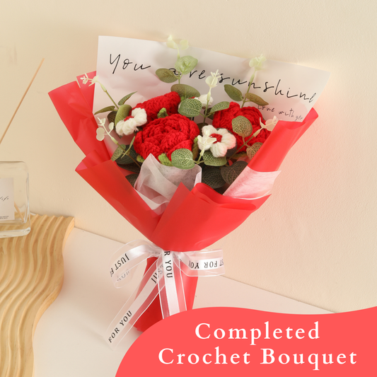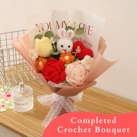 Completed Handmade Crochet Flower Bouquet (Red Roses, Daisies, and Crochet Bunny Doll)