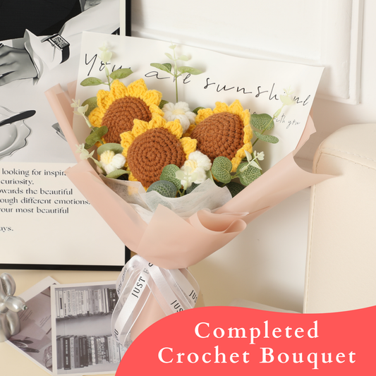Completed Handmade Crochet Flower Bouquet (Sunflowers, Daisies, Eucalyptus Leaves, and Mixed Flowers)