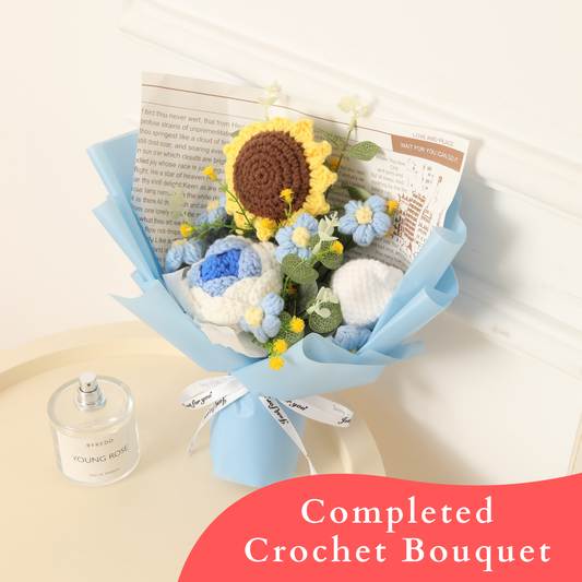 Completed Handmade Crochet Flower Bouquet (Sunflowers and Blue Mixed Flowers)