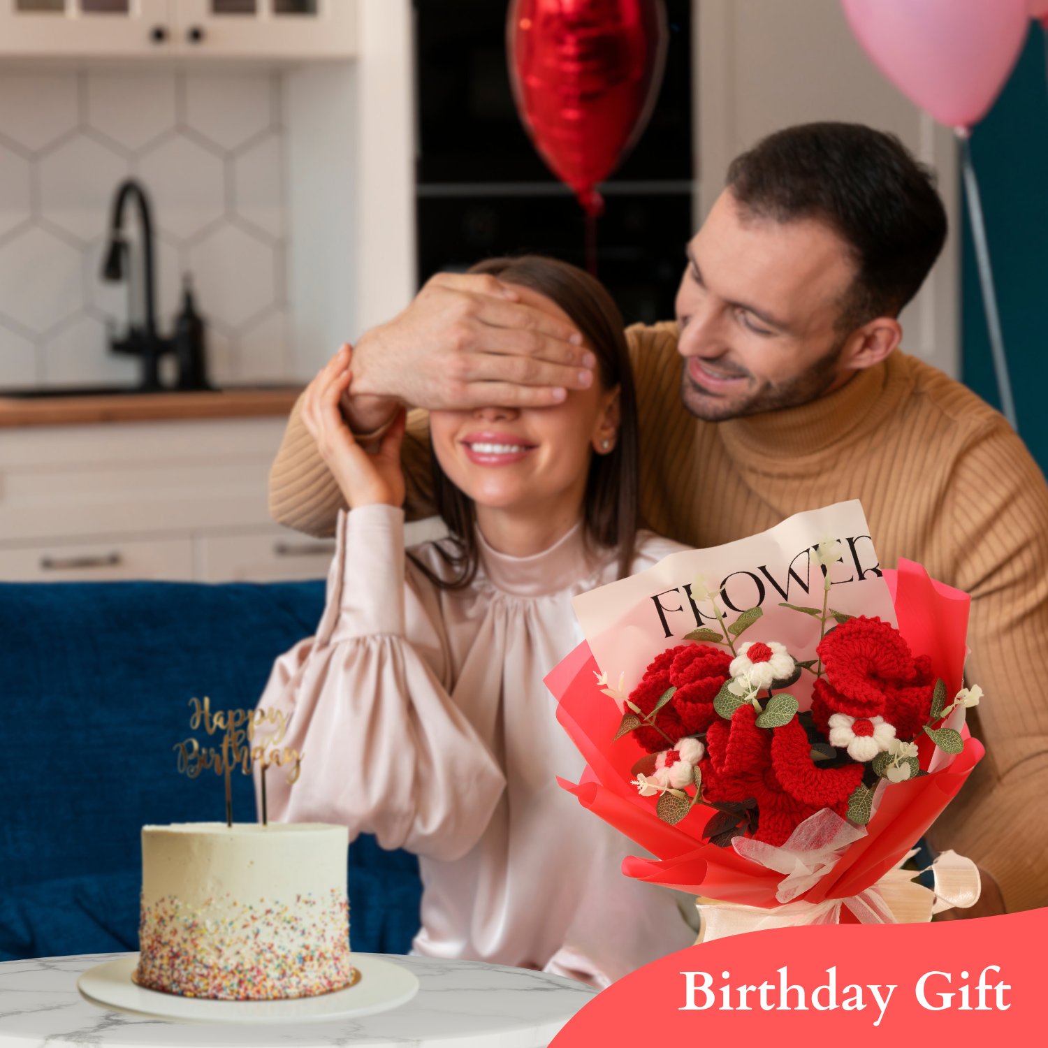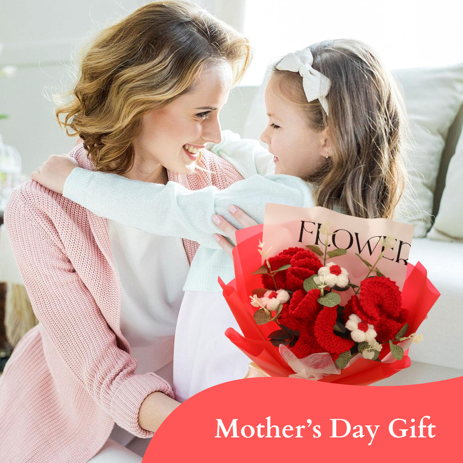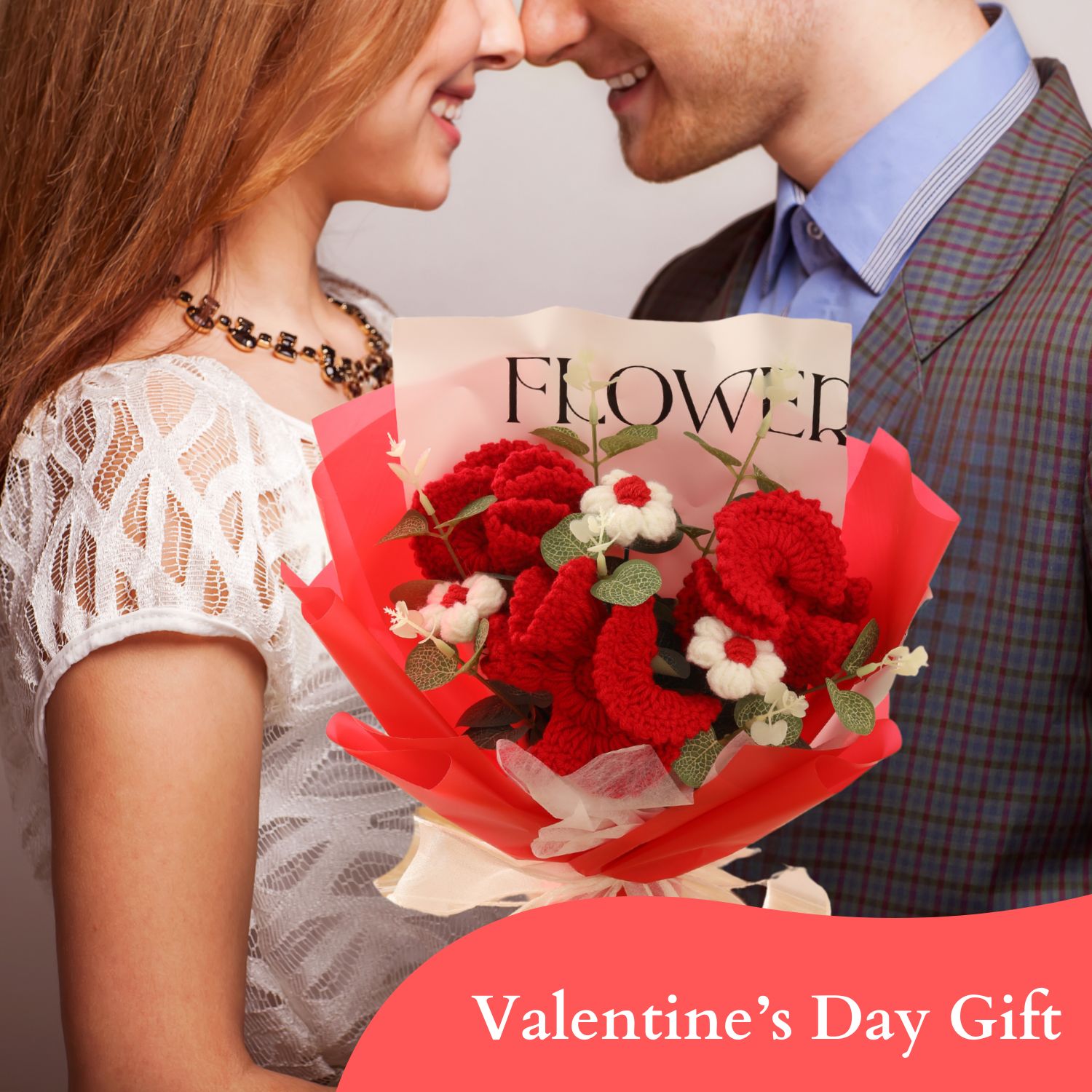 Completed Handmade Crochet Flower Bouquet (Red Carnations, Puff Flowers, Daisies, and Eucalyptus Leaves)